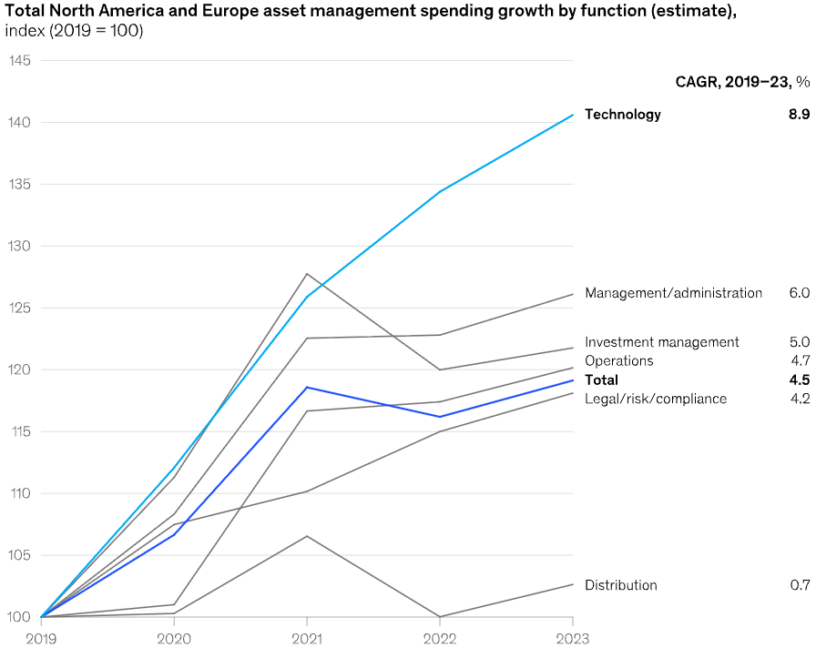 Legacy technology stacks rely on snapshot reporting where data is often reported with a lag rather than in real time. This approach creates severe operational friction. Not surprisingly, the gap between tech-enabled firms and legacy managers is widening rapidly. According to McKinsey, leading sponsors utilizing AI and advanced data analytics for portfolio monitoring report 30% to 40% productivity gains in analyst-intensive tasks. This is exactly why the asset management industry has doubled down on technology investments in the past few years.